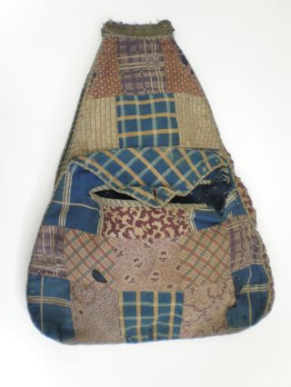 This patchwork pocket, in The Quilters’ Guild Collection, was almost certainly made around 1840. It has a side opening into the main pocket and a small pocket on the front. It would have been tied around the waist with a ribbon, often underneath a dress or coat, which would have had a special opening in the side to reach the pocket.